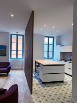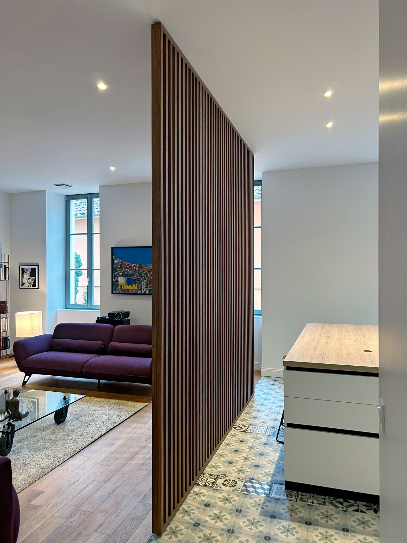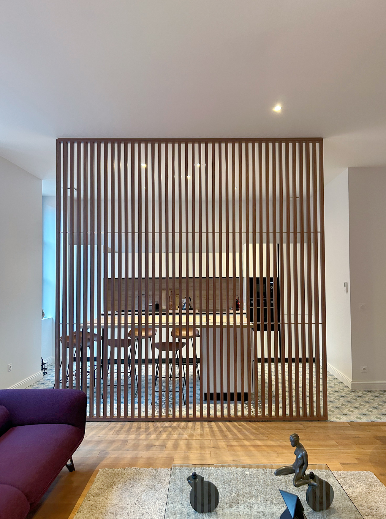 Dans un appartement ancien aux beaux volumes et aux hauts plafonds, les propriétaires souhaitaient marquer la séparation entre la cuisine et le salon, sans cloisonner l’espace.