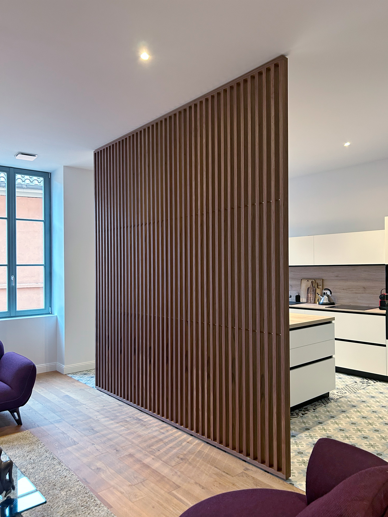 Réalisée en noyer, la claustra s’élève du sol au plafond, inscrivant dans la pièce un carré parfait de 3×3 mètres.